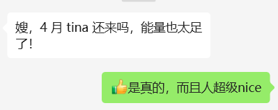 在线下,Tina是那种少见的,接触下来让人感觉超nice的女生,谦卑、礼貌、充满能亮,真诚。在发表本文之前,3月的一场线下分享活动中Tina也来参与过。尽管大家互不知情,但活动中的另一个成员对Tina评价如图:
